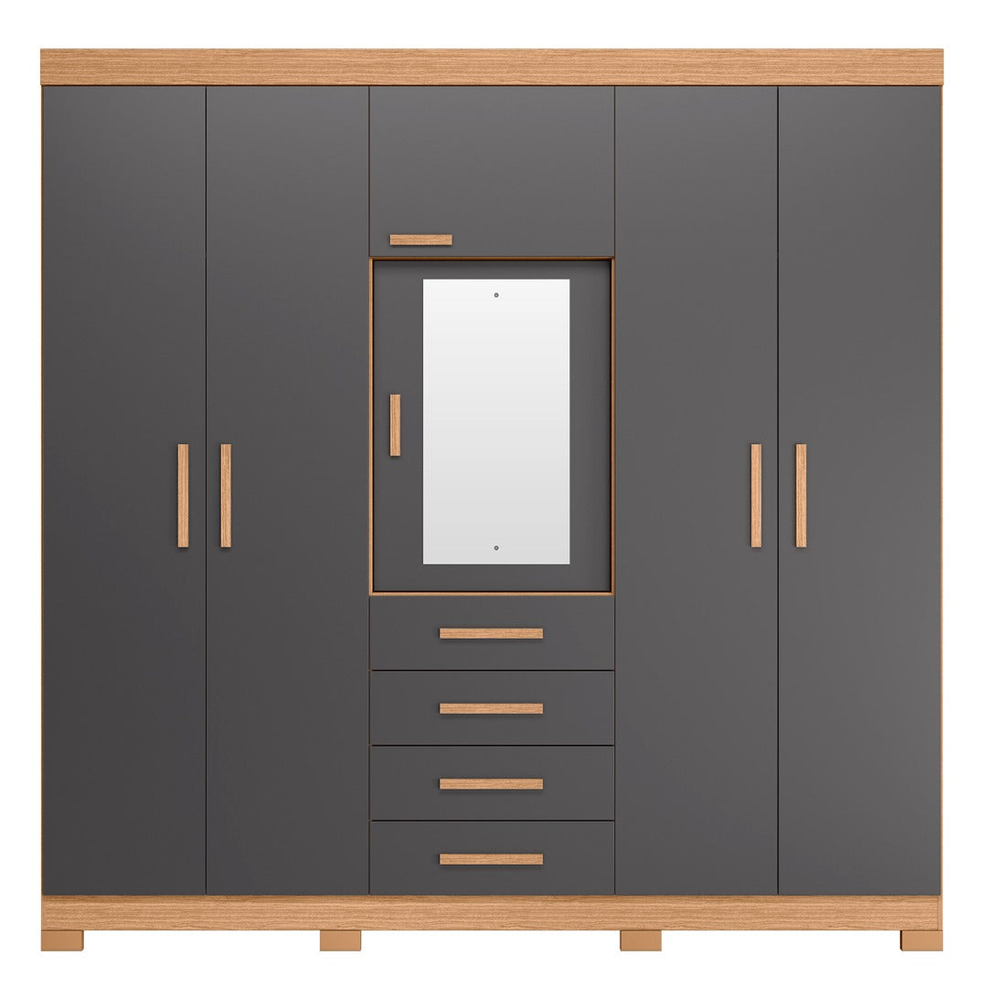 The Virtus Wardrobe is the perfect blend of modern sophistication and everyday functionality. With its spacious design, it features four drawers with telescopic slides, coated MDF handles, and aluminum hangers for a premium touch and long-lasting durability. The mirror screwed directly to the door (70 x 36 cm) adds convenience and elegance, while 35 mm hinges on the larger doors ensure strength and stability. Designed with sturdy feet and a sleek, contemporary finish, the Virtus Wardrobe brings a refined and organized look to any bedroom.