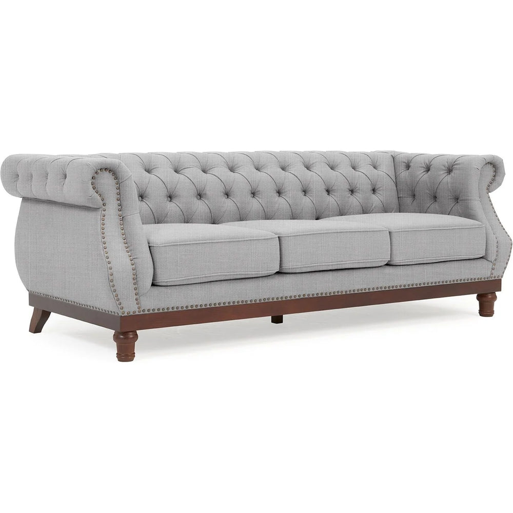 The Huda Linen 3 Seater Sofa, upholstered in linen, showcases classic Chesterfield details with its distinctive scrolled arms and deeply tufted, buttoned backrest. Enhanced by a contemporary metal studded trim, this sofa combines refined style with lasting comfort. It features generously padded, deep foam cushions for superior relaxation, supported by a robust ash-toned base and low-profile legs, ensuring both elegance and durability in your living space.