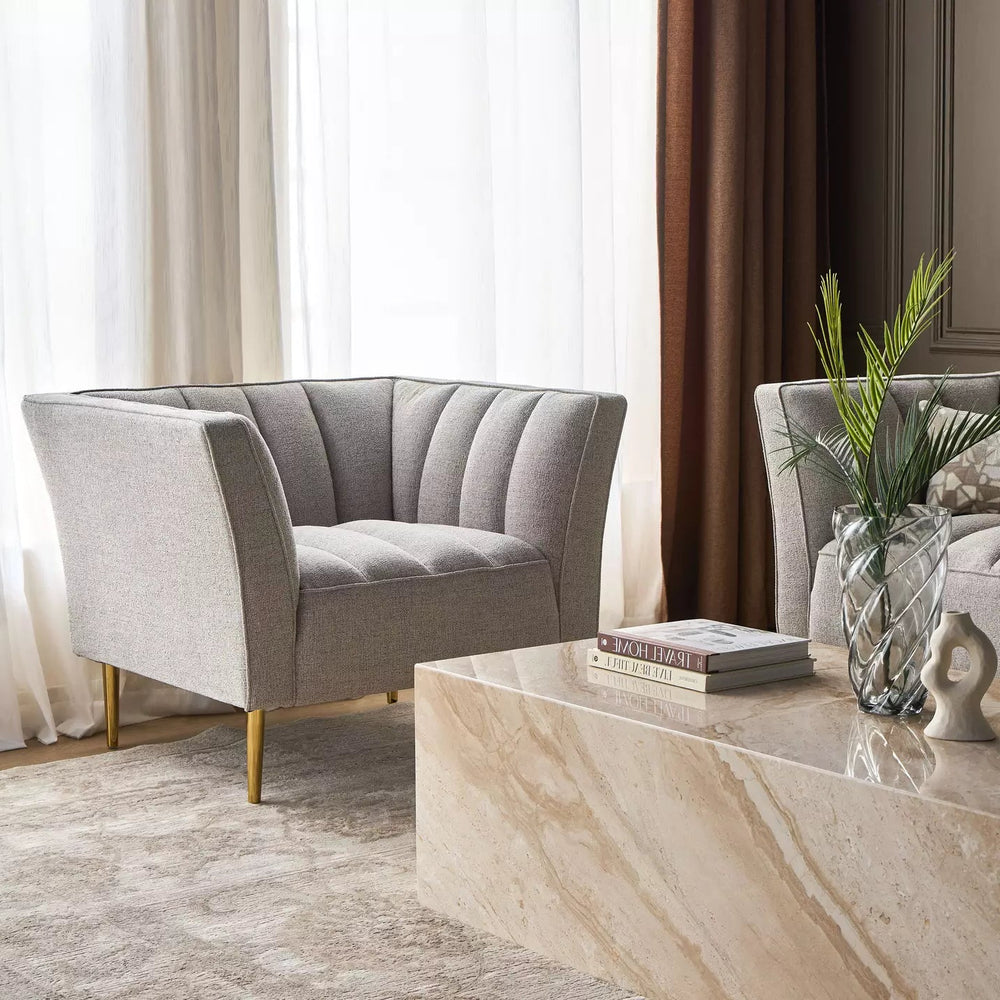 Elevate your living space with the Alora Fabric Armchair, where elegance meets comfort. The vertical channel tufted seat and back exude luxury, making it a chic addition to any room. Crafted with a durable wooden frame, this armchair promises lasting support and stability. Its metal legs not only enhance its sophisticated appearance but also seamlessly blend with various decor styles. The splayed tuxedo arms add a contemporary flair, offering both style and relaxation. Perfect for those who appreciate timeless design and quality craftsmanship, the Alora Fabric Armchair is a statement piece that complements any interior.