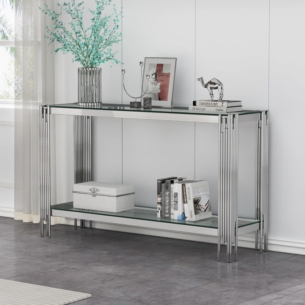 Display your favorite accessories from all angles with this clear Royal Crest Console Table. The sturdy frame is made from Gold steel and finished with durable Black tempered-glass inserts. Finish your new piece with fresh flowers in a Gold vase.