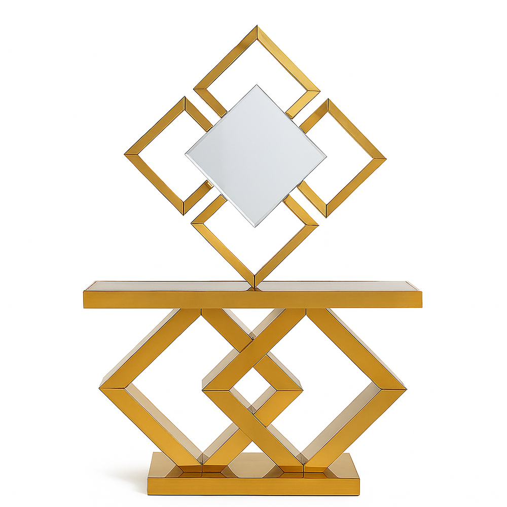Turn any entryway, hallway, or living room into a statement space with the Leyana Luxe Console & Mirror Set. This eye-catching duo blends modern geometric design with timeless luxury. The bold diamond-interlock base of the console table is mirrored by a sculptural square-framed mirror, both finished in radiant gold. Perfect for contemporary, glam, or luxury interiors, this set brings elegance, depth, and sophistication to any wall.