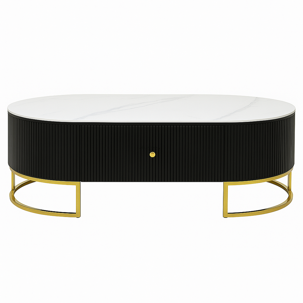 The Philippa Coffee Table is a statement piece that brings sophistication and elegance to any living space. Featuring a sleek oval design, it boasts a luxurious white marble-effect top with subtle veining that contrasts beautifully with the textured black base. The gold metal accents and curved open-frame legs add a touch of modern glamour, while the discreet central drawer offers practical storage for everyday essentials.