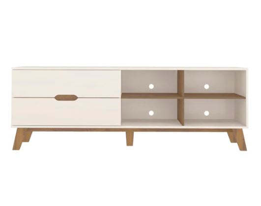 This elegant white Moreno TV stand, with 2 doors and shelves to store books, magazines, electronic devices, gaming consoles or your decorative items. Features metal legs for solid stability and rounded edges for safety. Supports up to 65 inch TV’s.