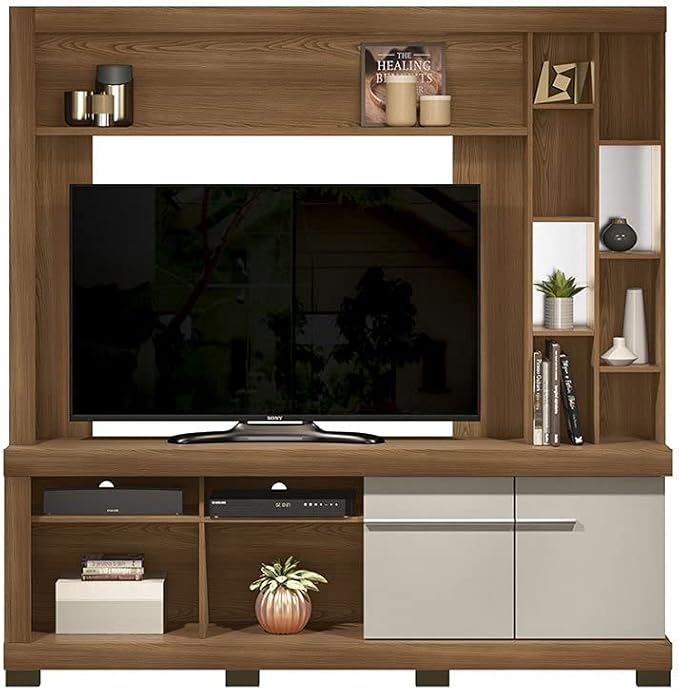 The MDP material used for this product allows for floor mounting and is perfect for living rooms. It features a support shelf and unique side niches with decorative mirrors, all in a sleek rectangular shape. This modern style is perfect for any room.