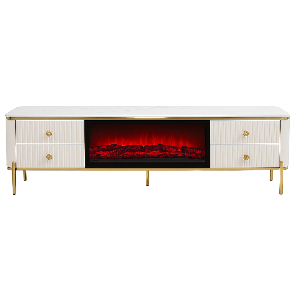 The Héloïse Modern Fireplace Plasma Stand brings together cutting-edge functionality and refined elegance. Designed in a sleek, elongated silhouette, it features a pristine white finish with delicate fluted detailing, complemented by gold trim and slender gold legs. At the heart of this masterpiece is a built-in electric fireplace, complete with a realistic flame effect that adds warmth and ambiance to your living space. With ample storage in four smooth drawers, this stand is the perfect fusion of style, practicality, and modern luxury—ideal for showcasing your TV while elevating your interior décor.