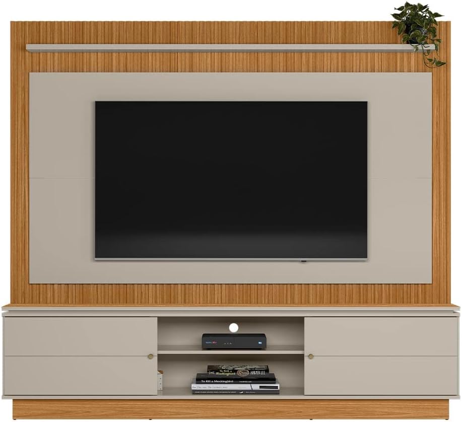 Elevate your living room with the Home Guararapes Wall Plasma Stand. Designed to accommodate TVs up to 75 inches, this unit features two sliding doors with molding details and aluminum handles, providing concealed storage for your media devices and accessories. The stand includes two shelves for displaying decorative objects and a top with beveled details, adding a touch of elegance to your space. Crafted from durable MDP and MDF materials, the stand boasts a Hanover/Off White finish that complements various interior decors. Integrated LED strips enhance the ambiance, making your entertainment area both stylish and inviting.