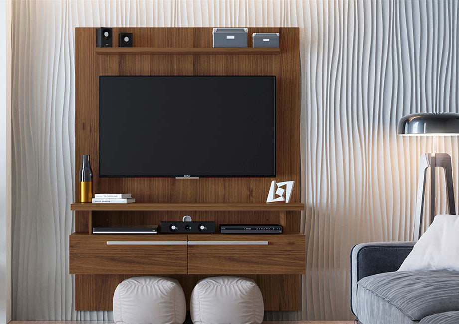 Elevate your living room with the New Caju Plasma Stand. Designed to accommodate TVs up to 55 inches, this stand features a contemporary design with high-definition printing technology that mimics a woody texture, adding warmth and elegance to your space. The unit includes two hinged doors with aluminum handles, providing concealed storage for your media devices and accessories. Three open niches and a top shelf offer additional space for displaying decorative items. Crafted from durable MDP with UV painting, the stand ensures longevity and a refined appearance. Its compact design makes it suitable for smaller living rooms, optimizing space without compromising on style.