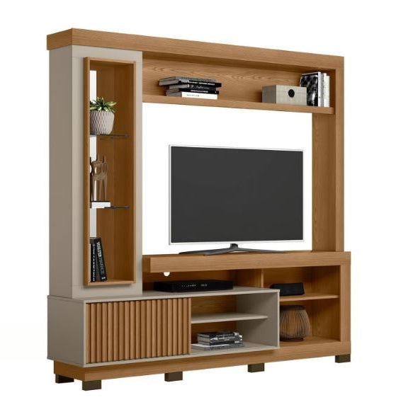This stylish entertainment unit is perfect for entertainment setups that have a modern and sleek look. It has a reliable and sturdy construction that will last for years. Its available in a classy dark brown and off white finish that creates an inviting and friendly vibe.in addition, it can accommodate a TV up to 55 inches.