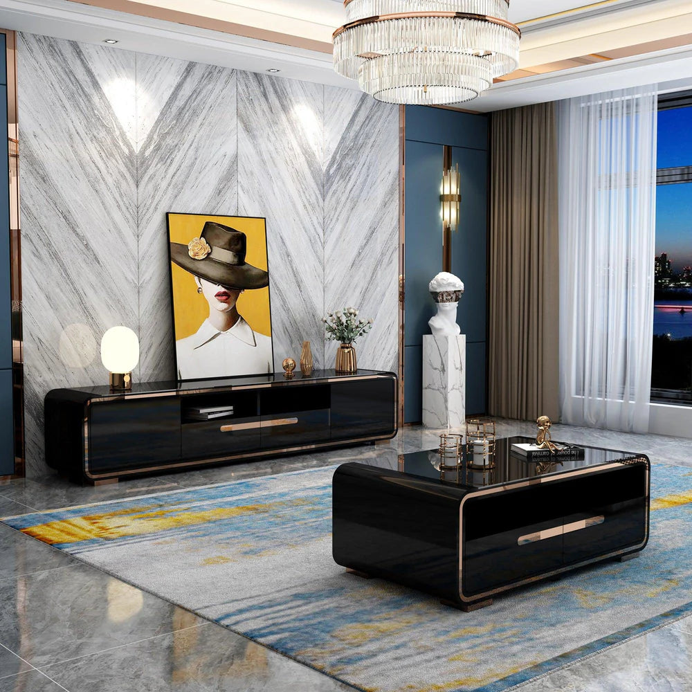 Odora Plasma TV stand will be a seamless addition to living room. with its gloss black finish and versatile storage options, adding the rose gold color stainless steel outline, this is sure to make your home entertainment system sparkle.