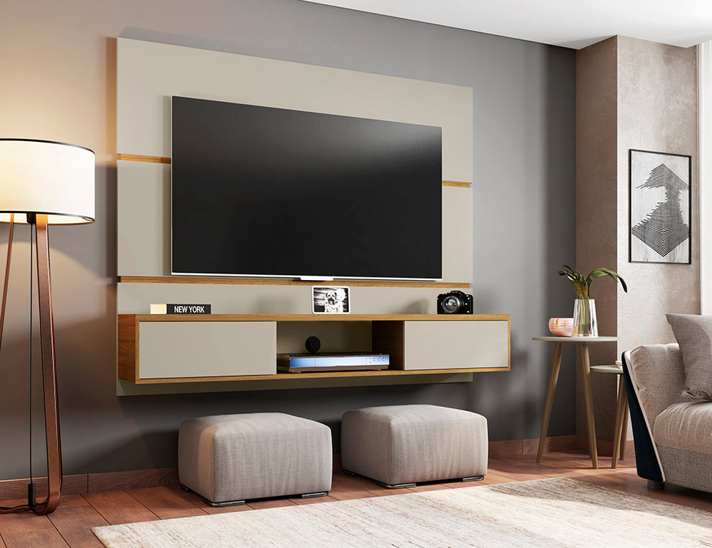 The Painel Ambar Wall Plasma Stand is a stylish and functional addition to any modern living space. Crafted from durable 25mm MDP, this wall-mounted TV unit features a generous top surface and a spacious niche, providing ample room to display your décor and electronic devices. The stand includes functional doors with steel hinges, offering additional storage space to keep your living area organized. Its sturdy construction ensures it can support heavier weight loads, making it suitable for TVs up to 65 inches.