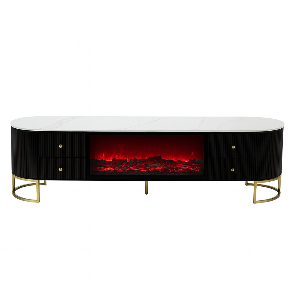 The Philippa Fireplace Plasma Stand combines modern luxury with practical functionality. Its elongated oval silhouette features a refined white marble-effect top with soft veining, perfectly balanced by a sleek black textured base. The built-in electric fireplace delivers a realistic flame effect and cozy ambiance, while the gold metal accents and open-frame legs add a glamorous touch. With four spacious drawers, it offers discreet storage for media accessories, keeping your living space stylish and clutter-free.