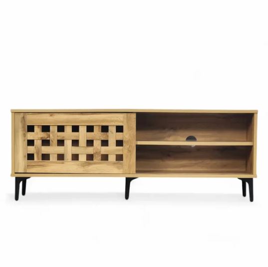 The TV stand we offer adds a touch of elegance to your home décor. Crafted with metal legs and premium engineered wood, this TV cabinet ensures stability and durability. The spacious desktop accommodates up to 42 inch tv’s. The TV stand is designed with shelves and two sides storage enclosed by lattice doors design, offering ample space for accommodating cable boxes, DVD players, tapes, magazines, and more. Its captivating modern style effortlessly complements various home décors. With its timeless elegance, this versatile TV entertainment center is suitable for enhancing the ambiance of living rooms, bedrooms, and beyond.