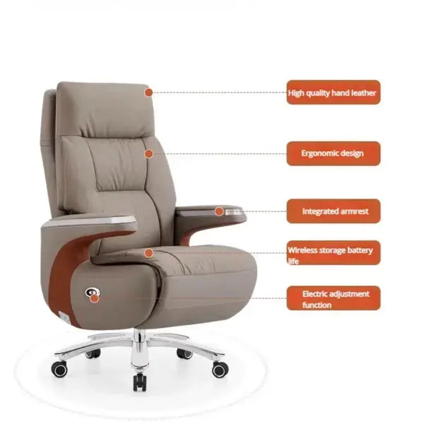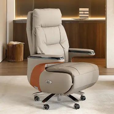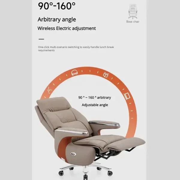 The Avelino Executive Recliner Chair combines modern style with luxurious comfort, making it the ultimate choice for executives and home offices. Upholstered in high-quality synthetic leather, this chair boasts a plush double-layered backrest, thick cushioning, and an ergonomic design that supports long hours of work or relaxation. With its electric reclining function and synchronized footrest, you can switch seamlessly between work mode and rest mode. Sleek chrome-finished armrests, smooth swivel movement, and premium PU castors enhance both its look and functionality. Whether placed in a professional office or a home study, the Avelino adds a touch of sophistication and supreme comfort.