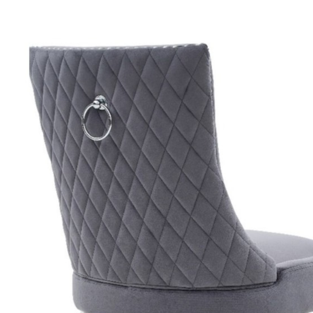 Add a touch of refined elegance to your dining space with the Paula Low Back Dining Chairs. Upholstered in plush velvet-like fabric, these chairs offer luxurious comfort and timeless style. The gently curved low backrest, adorned with a diamond-stitched pattern, adds both sophistication and support. Nailhead trim detailing along the edges enhances their tailored look, while the back features a striking lion’s head ring pull for a bold, decorative touch. Supported by sturdy, polished metal legs in a sleek silver finish, these chairs effortlessly combine modern glamour with lasting durability — perfect for everyday dining or special occasions.