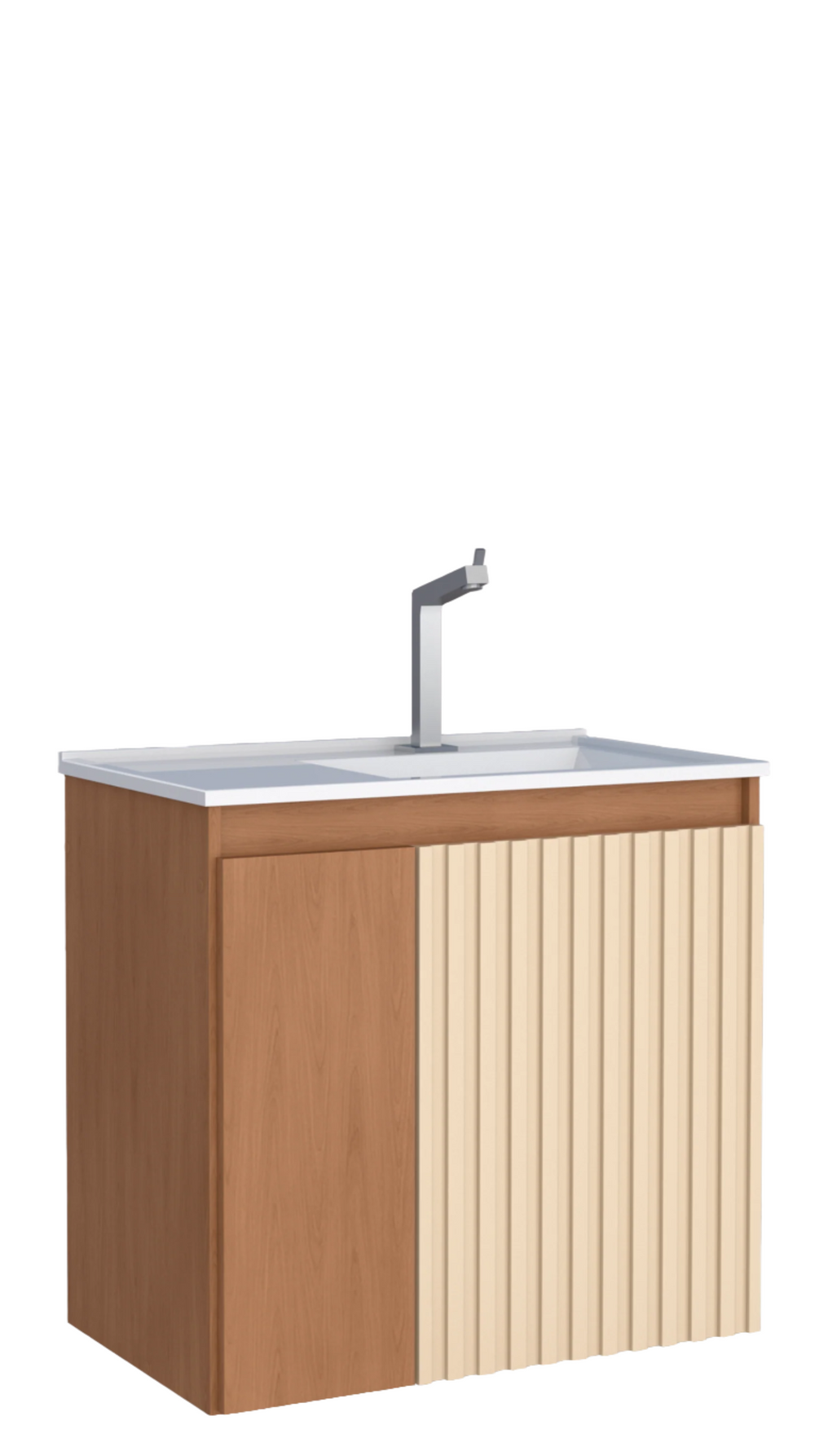 The Camomila wooden bathroom brings the slatted finish trend to the line of complete kits. In addition to the slatted door, which has a coating for better finishing and durability, it also has an internal shelf, a washbasin with the option of sand or white, an internal drawer with telescopic slide and a mirror with a cabinet and shelf.
