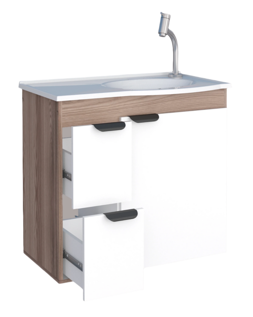 The Margarida wooden bathroom vanity is ideal for keeping everything tidy in your bathroom. Made from wooden sheets, it has a synthetic marble sink with curved lines, two drawers and an internal space to store hygiene and cleaning products, a steel handle with a minimalist shape.