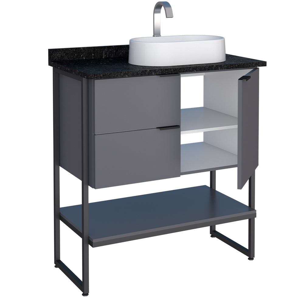 The Nilo wooden bathroom cabinet is ideal for keeping everything tidy in your bathroom. Made with wooden sheets, protected by a melamine surface, it has a washbasin in white porcelain and brushed black granite options, two drawers and a door with internal space to store hygiene and cleaning products, a shelf, steel handles.