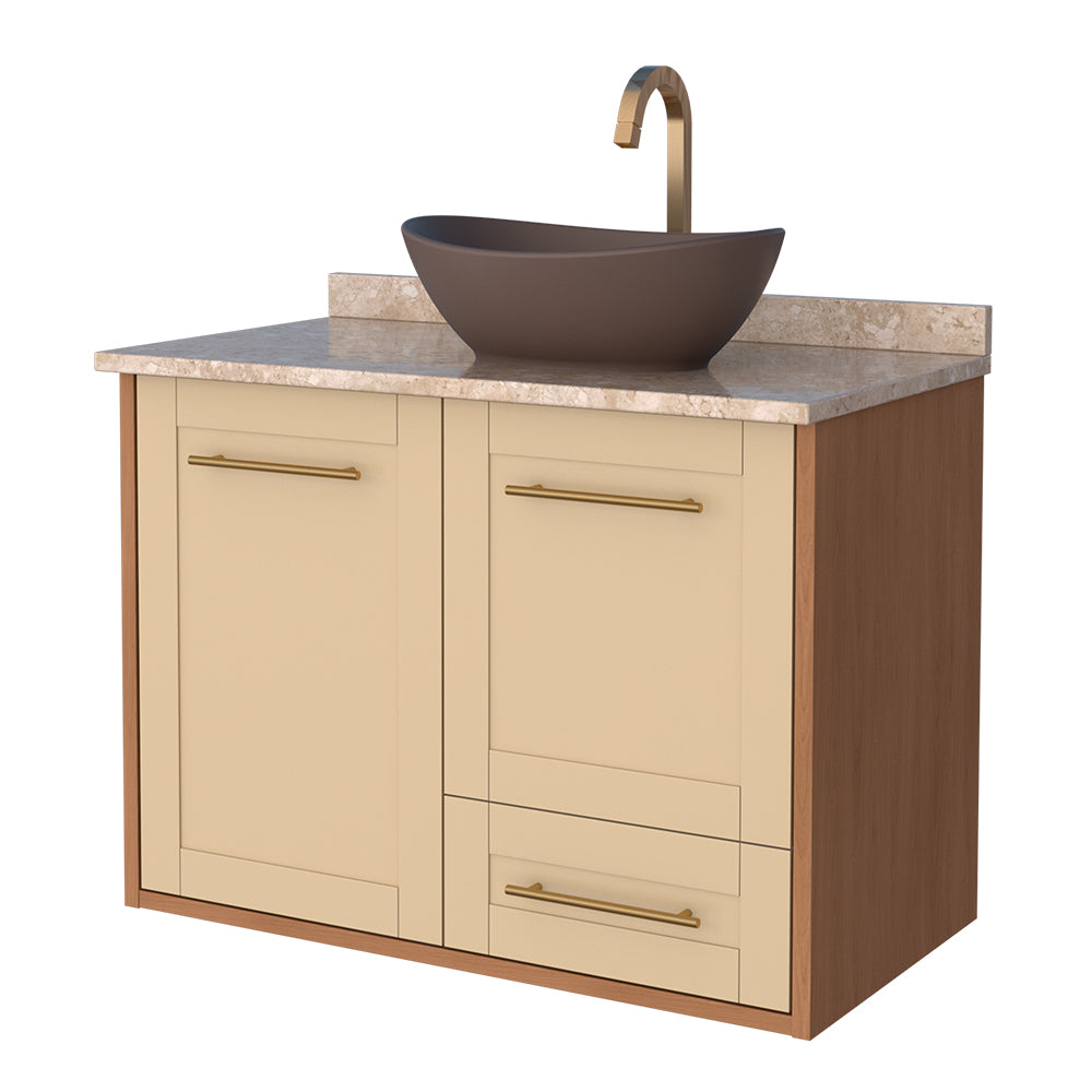 The Petunia wood bathroom combines classic with a modern unique Provençal style. Ideal for bathrooms with ample space, it has a travertine marble top, covered front for a better finish and durability, as well as aluminum handles, easy-gliding slides, soft-closing doors and a shelf for more organization.