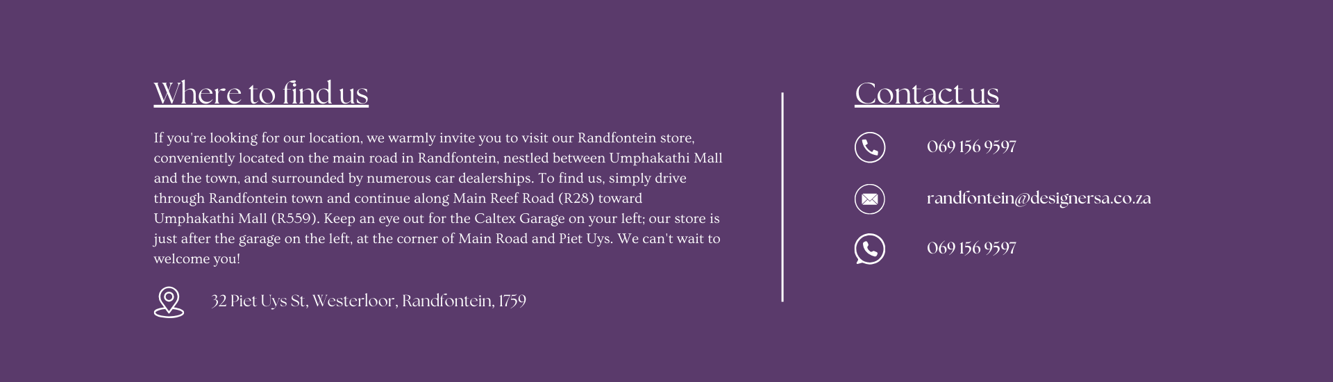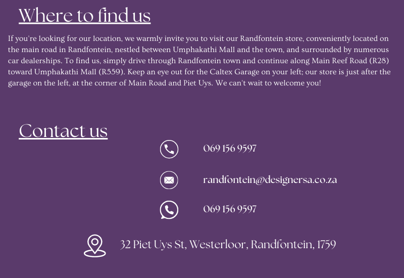 Randfontein, a delightful gold mining town located in Gauteng, South Africa, is only 40 kilometers away from Johannesburg. Our store, situated on Piet Uys Road between Umphakathi Mall and the heart of Randfontein, features an extensive range of stunning home furnishings, including comfortable sofas and striking dining tables. Come visit us and turn your house into the home of your dreams!